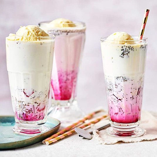A rich and creamy dessert drink made with vermicelli, milk, rose syrup, and ice cream.